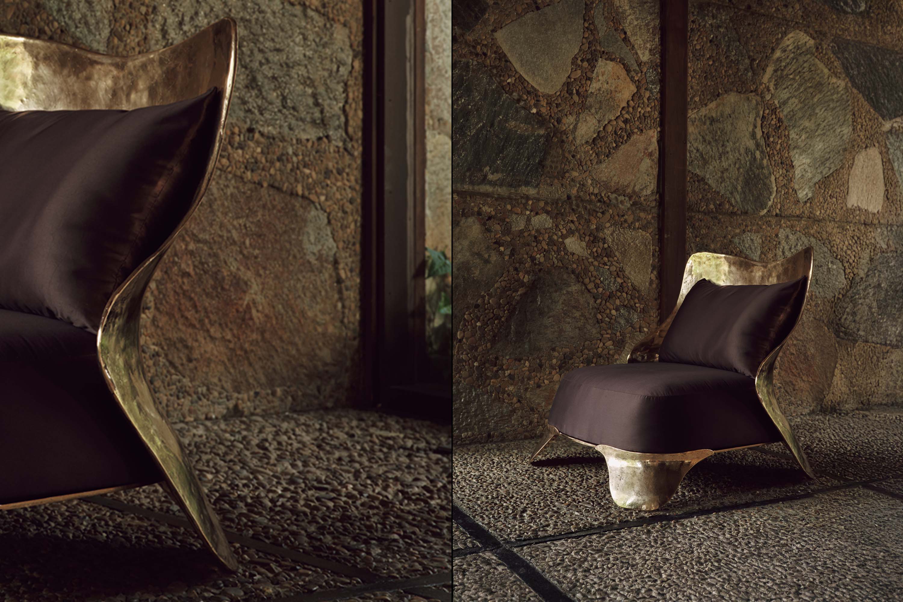 Designed and sculpted by Emily Thurman, the Hundō Lost-Wax Bronze Chair expands the vocabulary established by the Hundō Daybed, exploring how a seating form can hold both mass and curvature while remaining grounded in the logic of casting. First modeled entirely in plaster, the chair carries the direct imprint of Thurman’s sculptural gestures — lines carved by hand that become structural contours once poured, welded, and meticulously polished in bronze in Milan.
