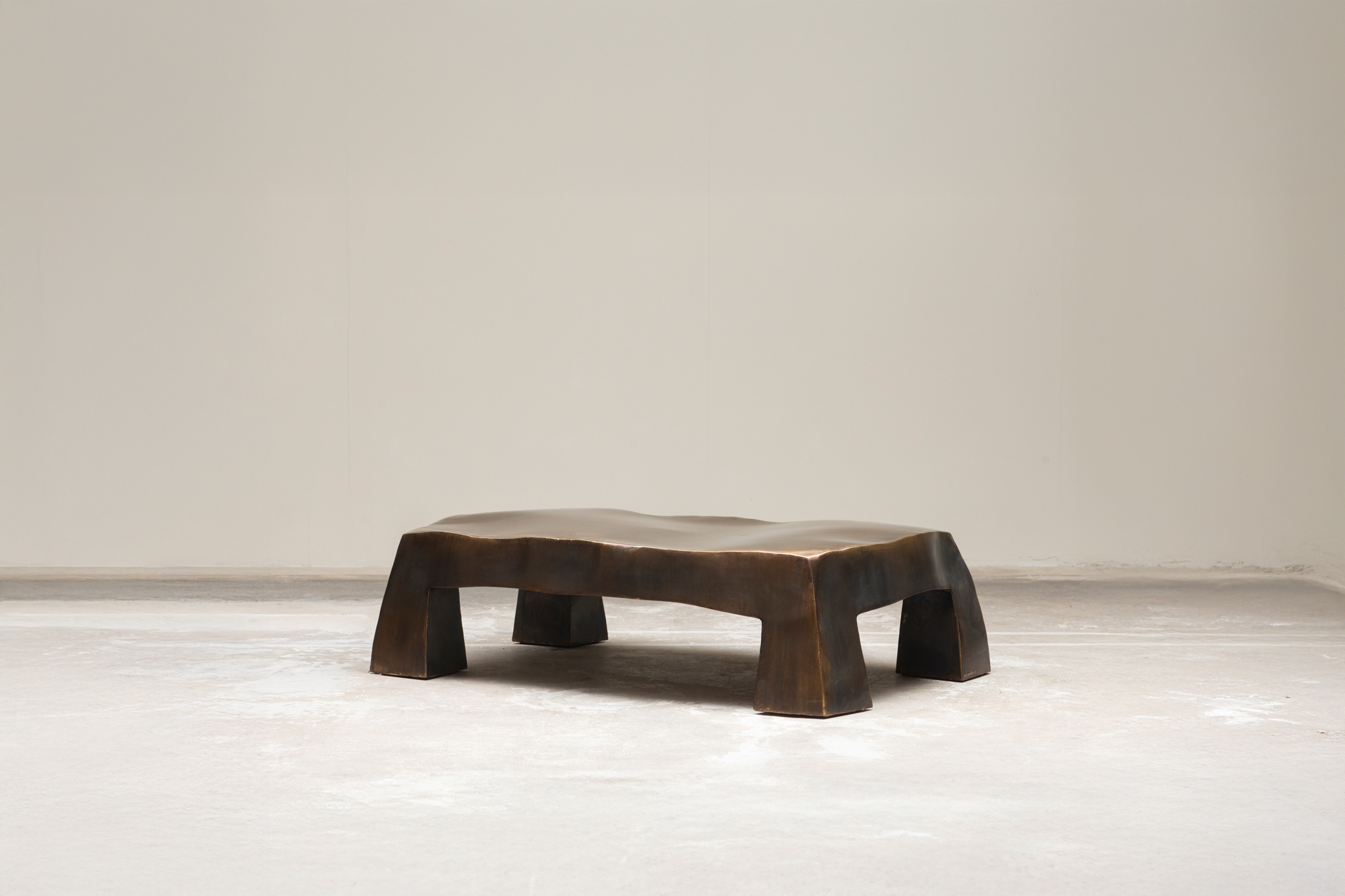 With this sculptural coffee table in darkened brass, Nick Valentijn explores how mass and fluidity can coexist within a single form. The deep patina contrasts with softly contoured surfaces, creating muted reflections that shift subtly with the light. What appears heavy becomes almost liquid — an object that reveals more through movement and time. It’s a coffee table, but also a quiet exploration of surface, balance, and perception.
